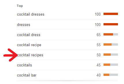 Note that although “cocktail recipe” appears fourth in this list, the combination of “cocktail recipe” an “cocktail recipes” actually tops the other keywords.