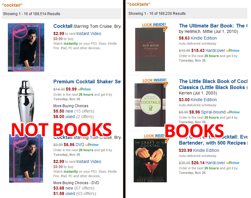 I also knew that I wanted the plural form of the word “cocktail” in my title. Here’s an Amazon search that demonstrates why:
