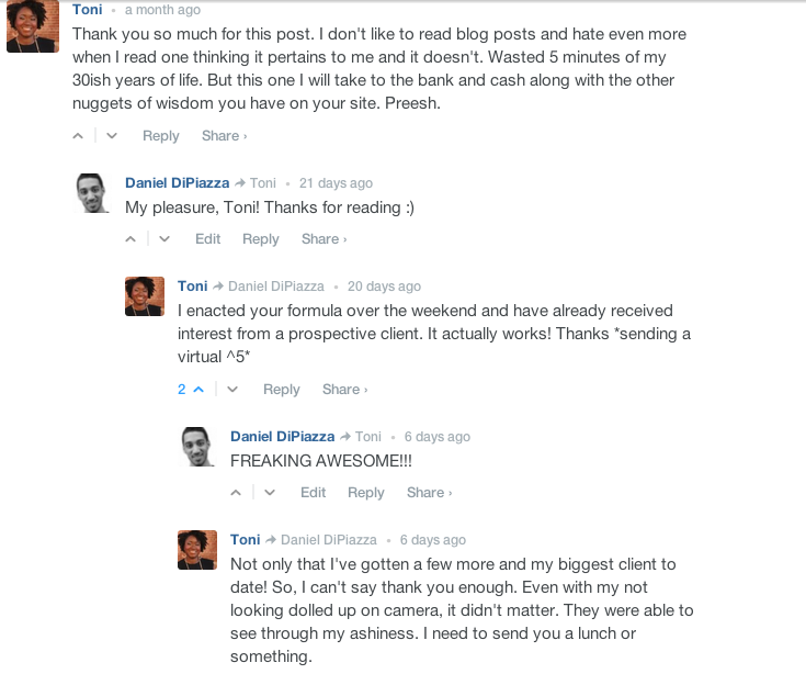 Now, after some time I’d learned how to offer REAL, TANGIBLE value to readers — and it was a very simple transition to turning readers into clients and the blog into a business.